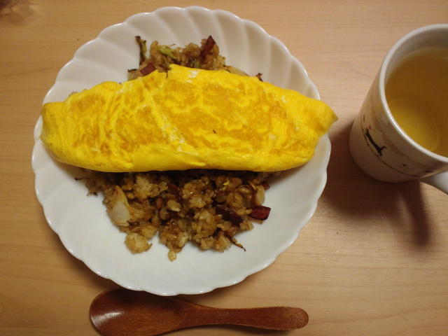 カリカリベーコンと白菜を炒め、ご飯を炒め、バター入れて、だししょうゆをちょっと入れて、しょうゆをたらーっと…