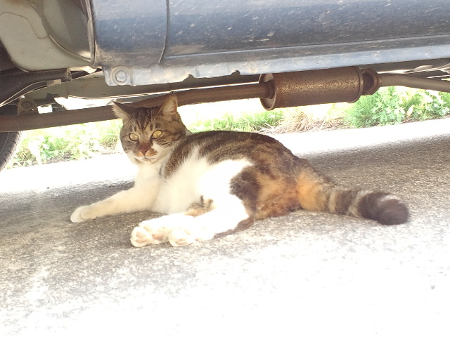 そうっとのぞき込むと、どこから来たのか、おデブな猫が日陰で涼んでいました(笑)