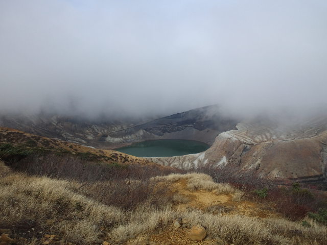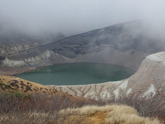 これはお釜は見られないかなぁと思っていたのですが、一時だけ霧が晴れてお釜が見えた!!