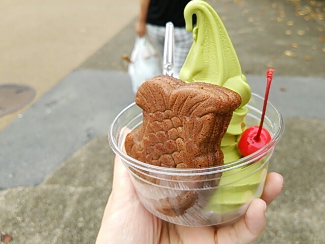 抹茶アイス&金シャチ焼(キャラメル)。アイス美味しかった!