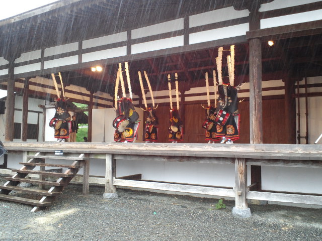 太鼓を叩いて歌いながら、頭を勢いよく下げて、白い棒のようなものを床に叩きつけます。