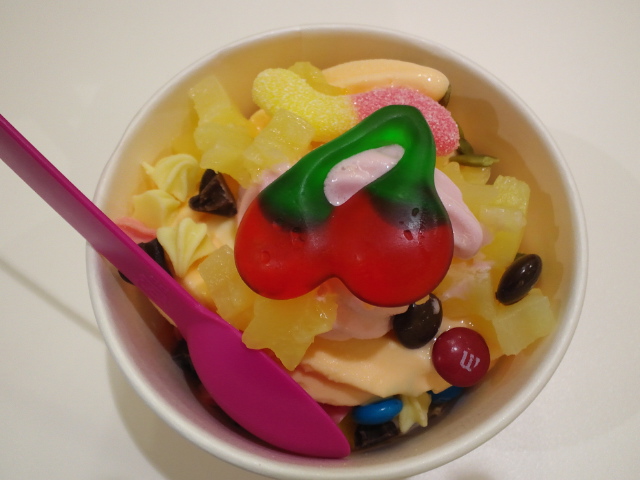 ここは、色んなフレーバーのアイスをソフトクリームのような機会でカップに入れ、トッピングを自由にし、最後に重さでお金を支払うというシステムでした。