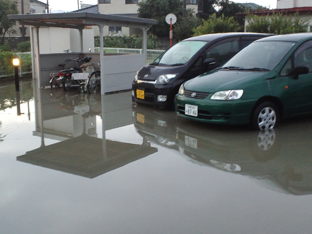 昨夜からの土砂降りの雨の影響で、家の駐車場に大きな水溜まりができました。この辺りは、深くても私の踝の上くらい。