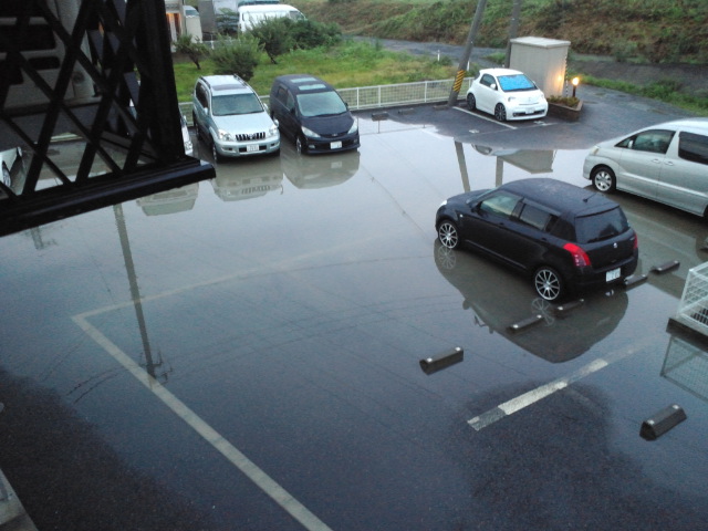 昨夜からの土砂降りの雨の影響で、家の駐車場に大きな水溜まりができました。この辺りは、深くても私の踝の上くらい。