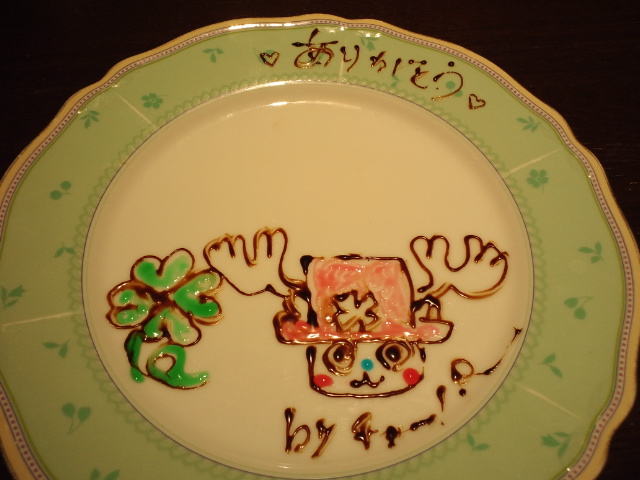 食後にアイスを食べながら、まったりしてたのですが、チョッパーの帽子をかぶった店員さんが、ケーキのサービスをしてくれました(≧∇≦)
