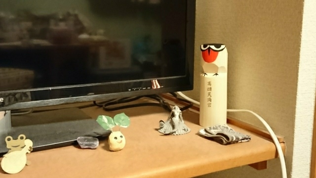 神棚に置こうかと思ったのですが、飾る場所はどこでもよいそうなので、可愛いので目につくここに。